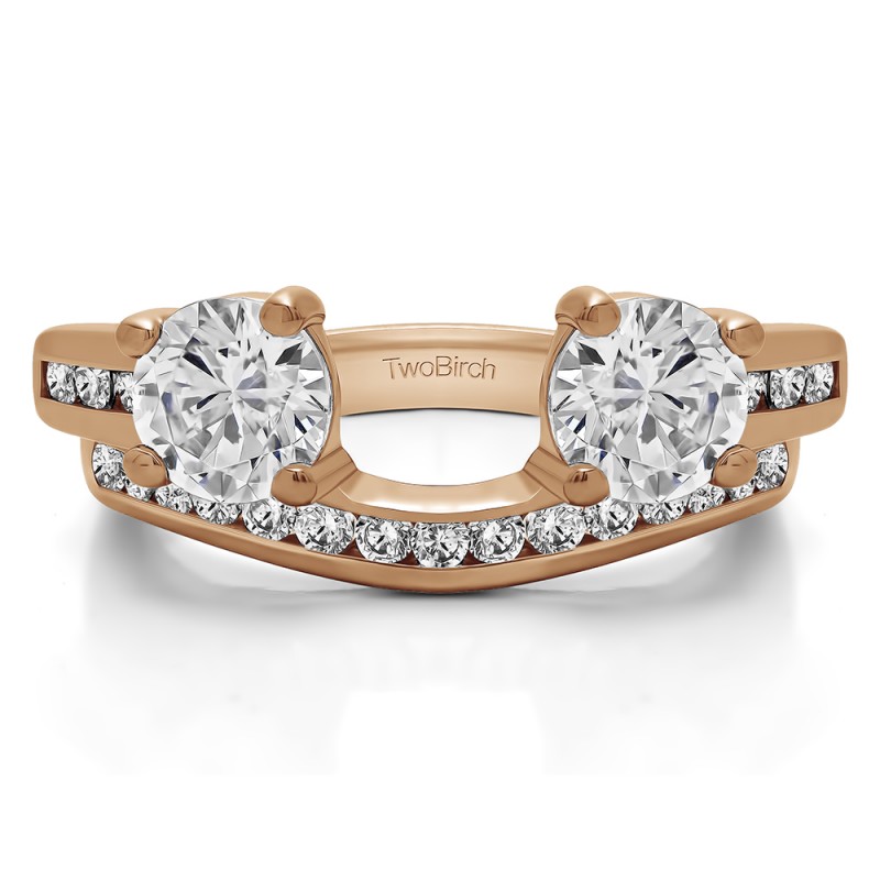 This ring wrap has 23 stones in total. It features a mix of round and round prong set stones with a total combined weight of 0.75 carats. It has a total width of 2 millimeters and features a row of channel set stones on the band and two prong set stones with channel set round accent stones. Once you add your solitaire, it will create the look of an accented three stone engagement ring with a matching channel set band. This ring wrap is made to fit a round solitaire from 0.75 carat up to 1.5 carat, or a marquise solitaire from 0.25 carat up to 0.5 carat, or a princess solitaire from 1 carat up to 1.5 carat.