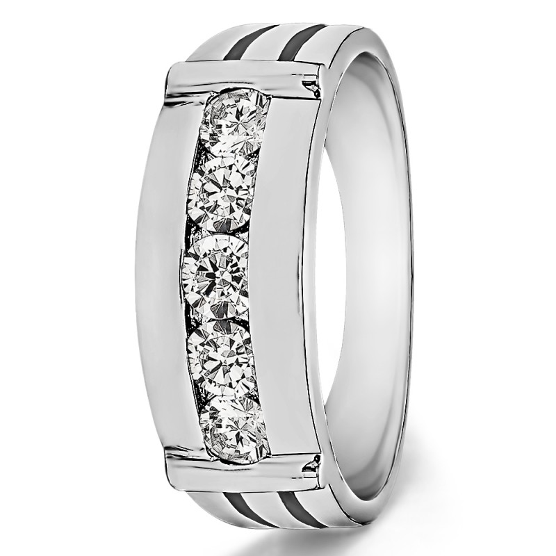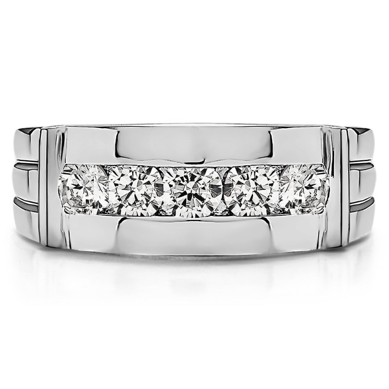 This men's ring features 5 white round channel set stones. The band measures 5.5mm in total width. The total combined carat weight is 0.17 carats. This listing features moissanite, cubic zirconia or natural diamonds. This men's ring weighs 10.36 grams and features a comfort fit band. This men's band has a ribbed shank and a raised detailing on each side of the cannel.