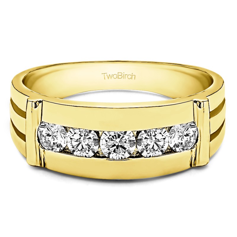 This men's ring features 5 white round channel set stones. The band measures 5.5mm in total width. The total combined carat weight is 0.17 carats. This listing features moissanite, cubic zirconia or natural diamonds. This men's ring weighs 10.36 grams and features a comfort fit band. This men's band has a ribbed shank and a raised detailing on each side of the cannel.