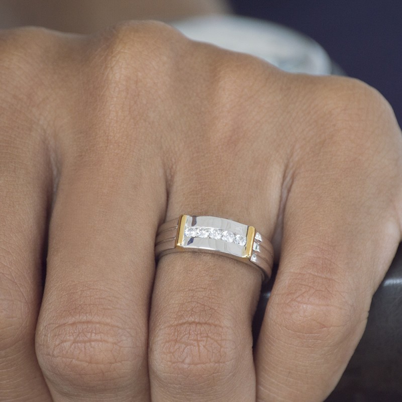 This men's ring features 5 white round channel set stones. The band measures 5.5mm in total width. The total combined carat weight is 0.25 carats. This listing features moissanite, cubic zirconia or natural diamonds. This men's ring weighs 10.13 grams and features a comfort fit band. This men's band has a ribbed shank and a raised detailing on each side of the cannel.