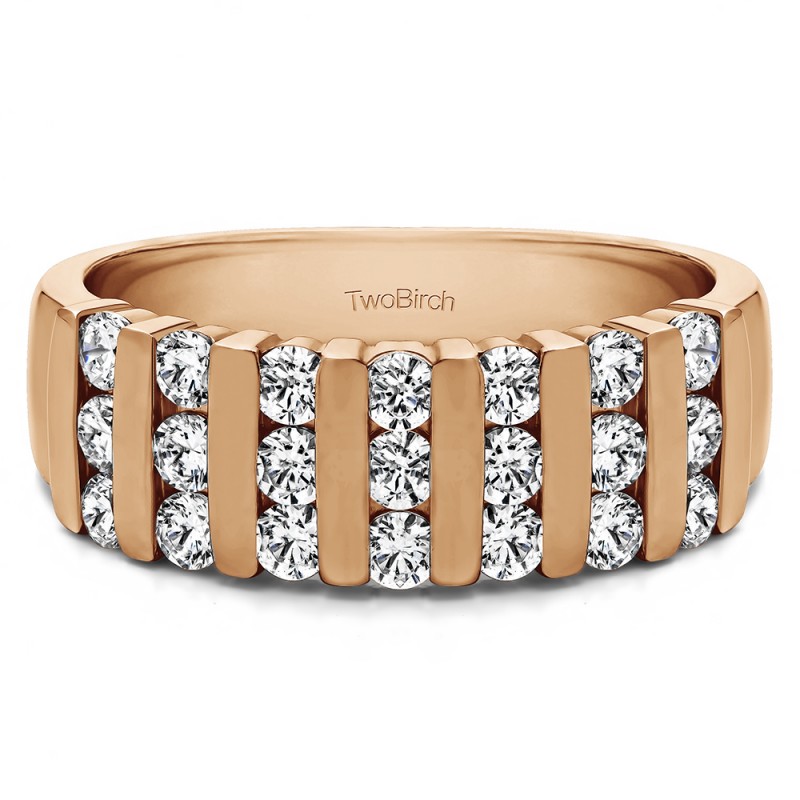 This wedding ring features 21 round bar set stones with a 2 millimeter wide band. The total combined carat weight of the ring is 0.26 carats. It has a unique three row design, set with shared bars. The shared bars are finished with a high polish. This wedding ring weighs approximately 4.39 grams.