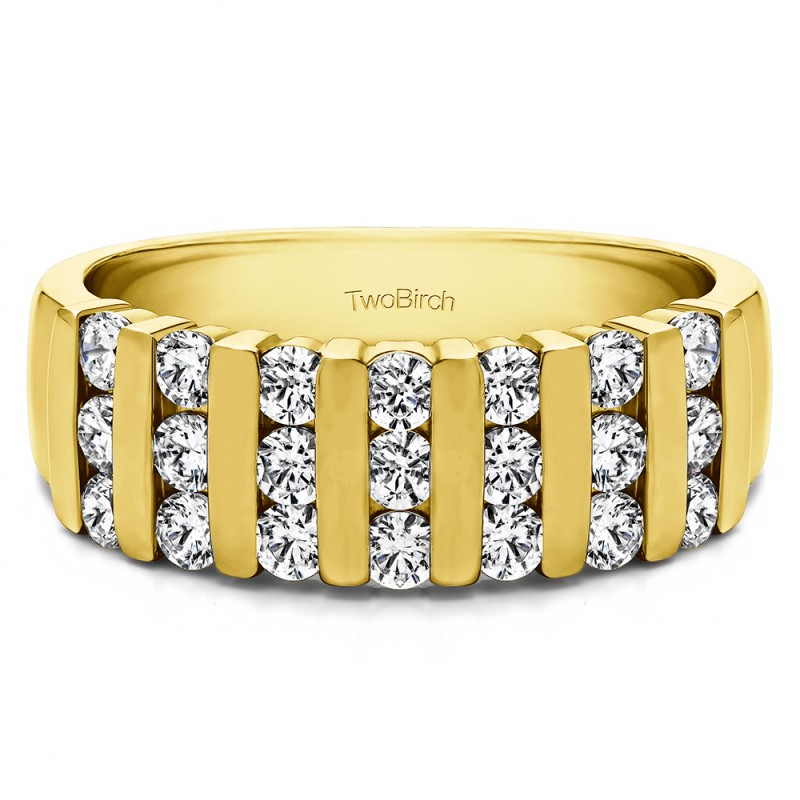 This wedding ring features 21 round bar set stones with a 2 millimeter wide band. The total combined carat weight of the ring is 0.26 carats. It has a unique three row design, set with shared bars. The shared bars are finished with a high polish. This wedding ring weighs approximately 4.39 grams.