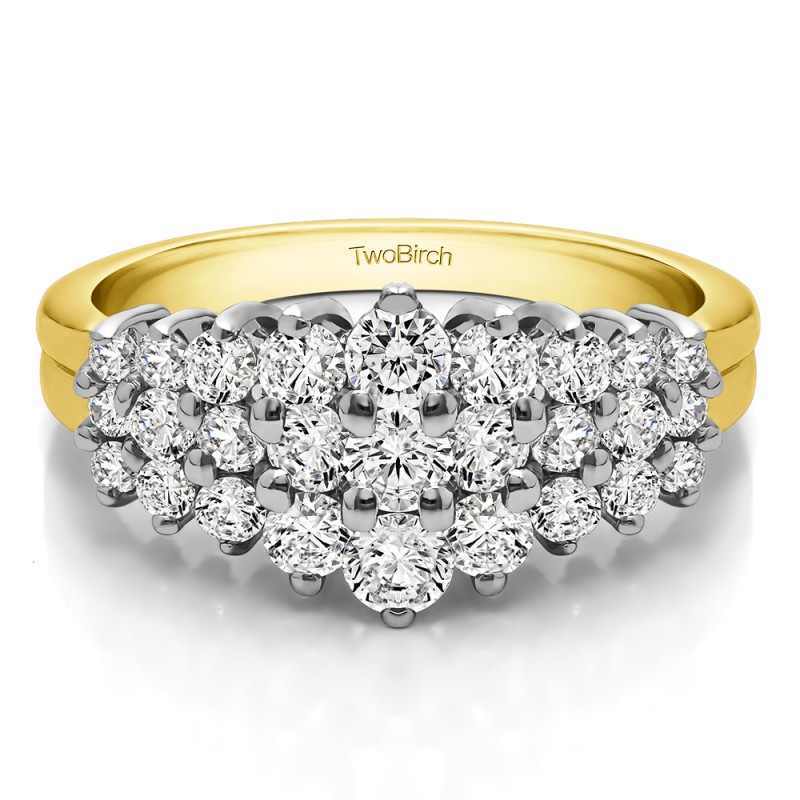 This wedding ring features 27 round prong set stones with a 2 millimeter wide band. The total combined carat weight of the ring is 0.49 carats. It has three rows of shared prong round stones in a domed design. This wedding ring weighs approximately 4.9 grams.