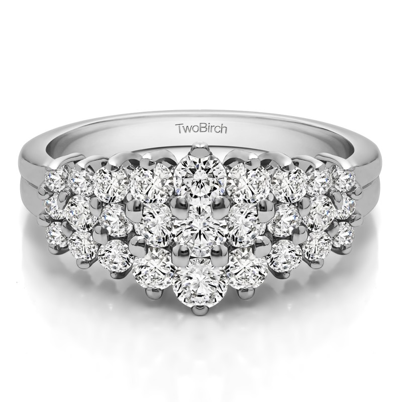 This wedding ring features 27 round prong set stones with a 2 millimeter wide band. The total combined carat weight of the ring is 0.49 carats. It has three rows of shared prong round stones in a domed design. This wedding ring weighs approximately 4.9 grams.