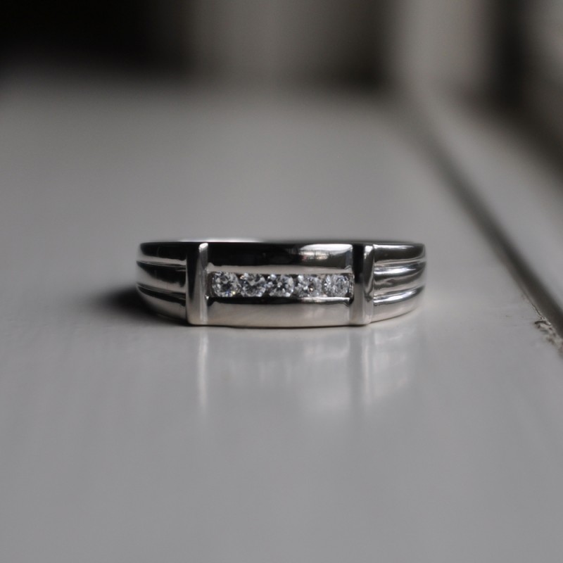 This men's ring features 5 white round channel set stones. The band measures 5.5mm in total width. The total combined carat weight is 0.5 carats. This listing features moissanite, cubic zirconia or natural diamonds. This men's ring weighs 11.72 grams and features a comfort fit band. This men's band has a ribbed shank and a raised detailing on each side of the cannel.