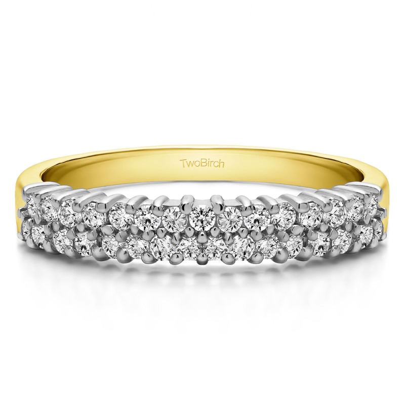 This wedding ring features 30 round prong set stones with a 2 millimeter wide band. The total combined carat weight of the ring is 0.5 carats. It features a double row of shared prong set round stones. This wedding ring weighs approximately 3.35 grams.