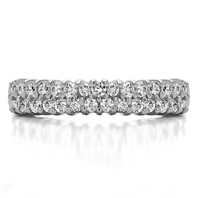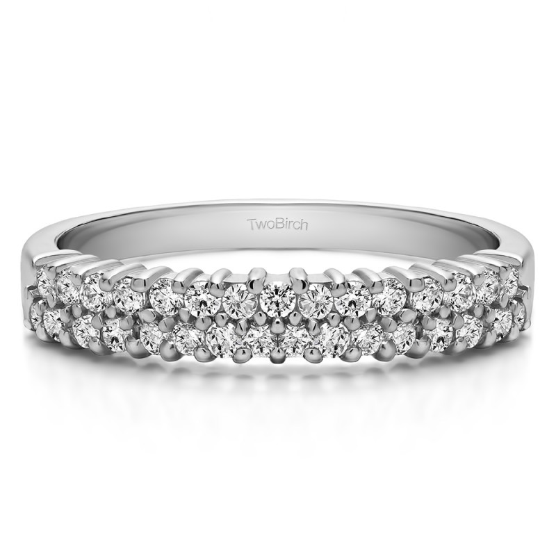 This wedding ring features 30 round prong set stones with a 2 millimeter wide band. The total combined carat weight of the ring is 0.5 carats. It features a double row of shared prong set round stones. This wedding ring weighs approximately 3.35 grams.