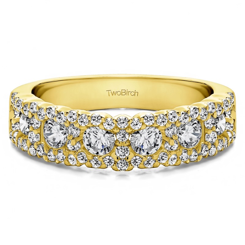 This wedding ring features 70 round prong set stones with a 2 millimeter wide band. The total combined carat weight of the ring is 0.84 carats. The six main stones are accented with smaller round stones on each side. This wedding ring weighs approximately 5.18 grams.
