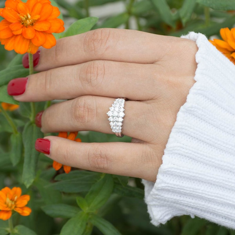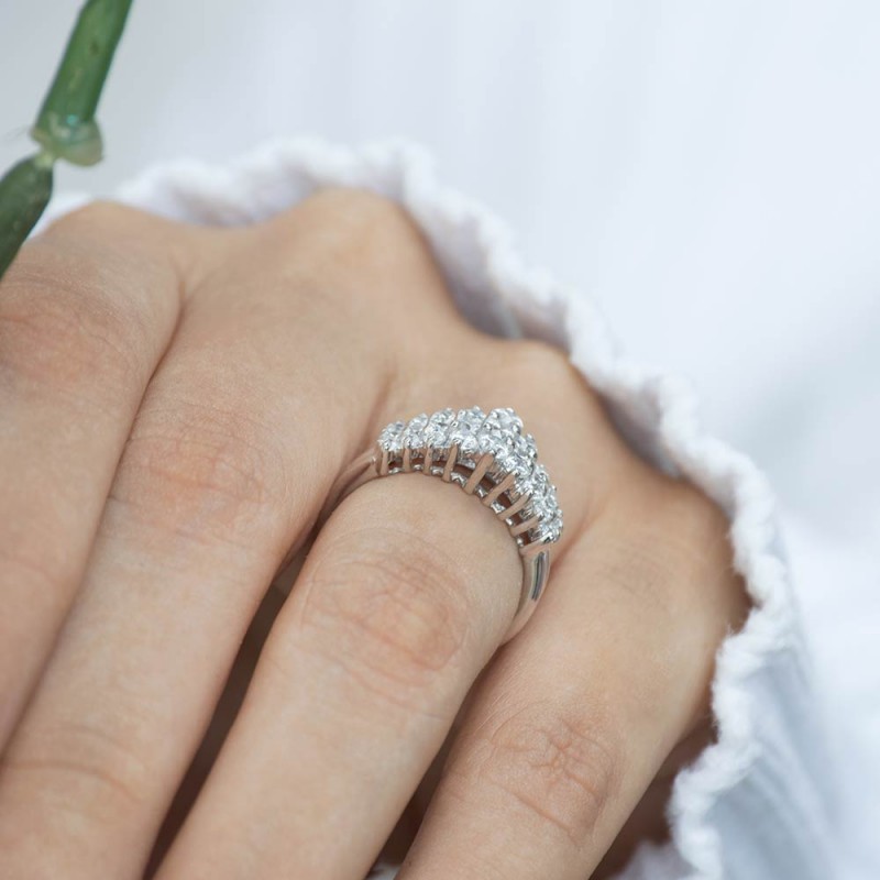 This wedding ring features 27 round prong set stones with a 2 millimeter wide band. The total combined carat weight of the ring is 0.99 carats. It has three rows of shared prong round stones in a domed design. This wedding ring weighs approximately 5.71 grams.