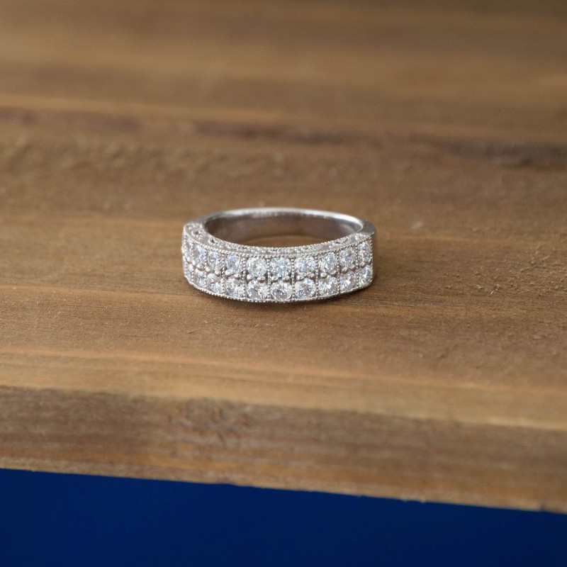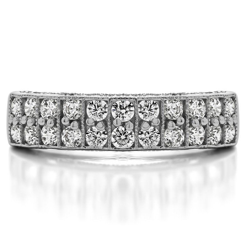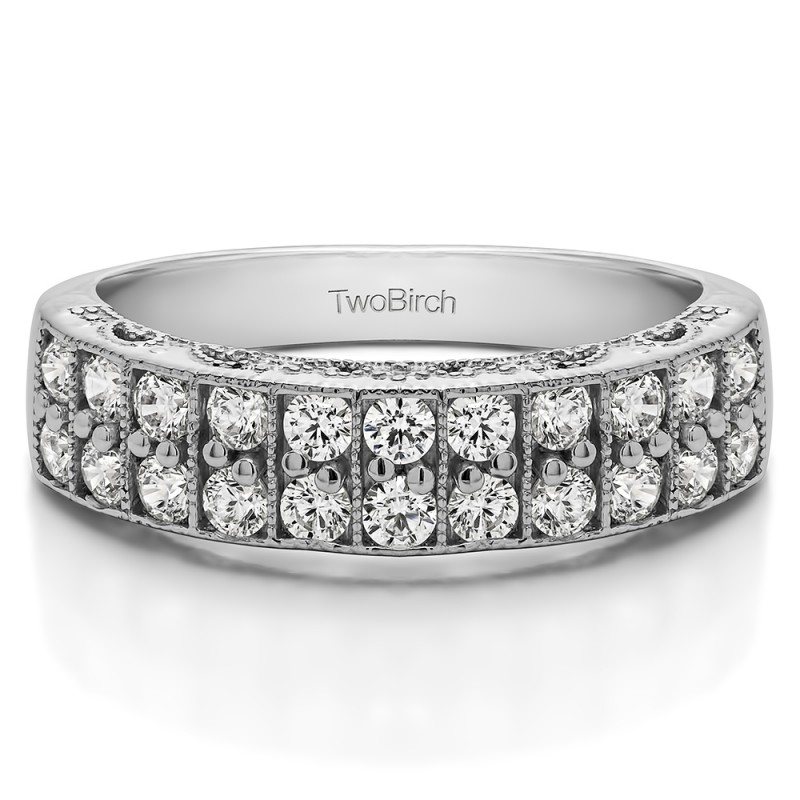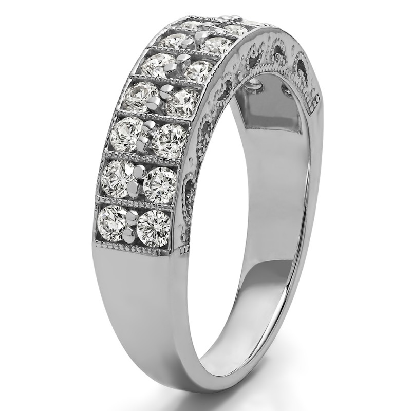 This wedding ring features 22 round channel set stones with a 2 millimeter wide band. The total combined carat weight of the ring is 0.99 carats. It has a double row of round stones with millgrained edges and filigree designs. This wedding ring weighs approximately 5.43 grams.