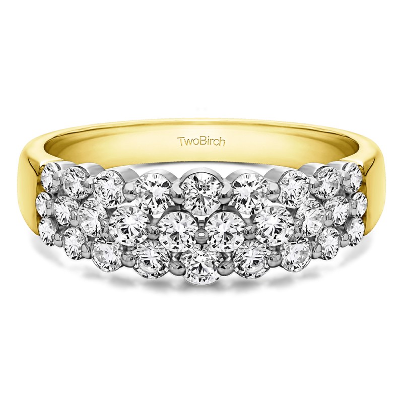 This wedding ring features 28 round prong set stones with a 2 millimeter wide band. The total combined carat weight of the ring is 0.99 carats. It has three rows of common prong set round stones. This wedding ring weighs approximately 4.61 grams.