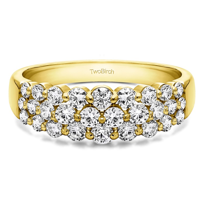 This wedding ring features 28 round prong set stones with a 2 millimeter wide band. The total combined carat weight of the ring is 0.99 carats. It has three rows of common prong set round stones. This wedding ring weighs approximately 4.61 grams.