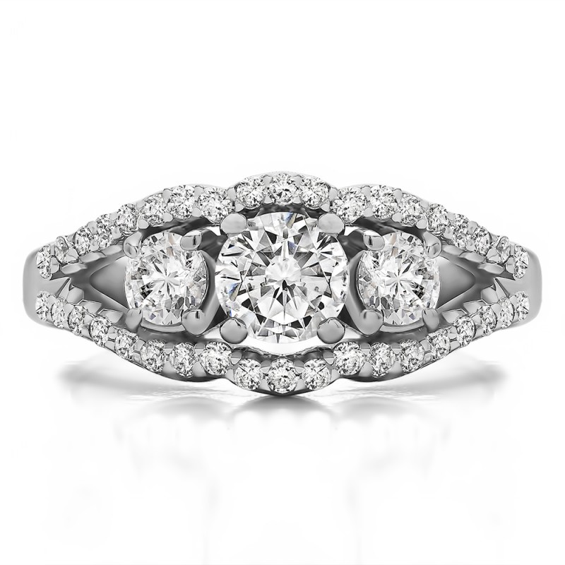 This wedding ring features 41 round prong set stones with a 2 millimeter wide band. The total combined carat weight of the ring is 1.04 carats. It has a traditional three stone design with a beautiful halo. This wedding ring weighs approximately 6.41 grams.