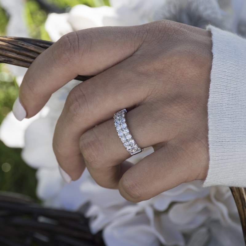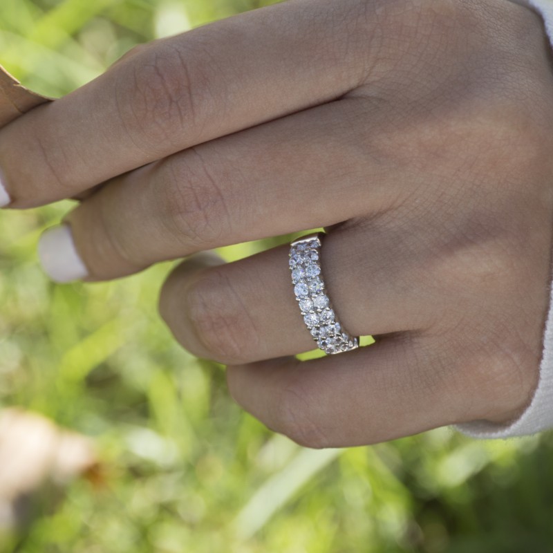 This wedding ring features 20 round prong set stones with a 2 millimeter wide band. The total combined carat weight of the ring is 1.5 carats. This ring has a double row of shared prong stones. This wedding ring weighs approximately 5.99 grams.