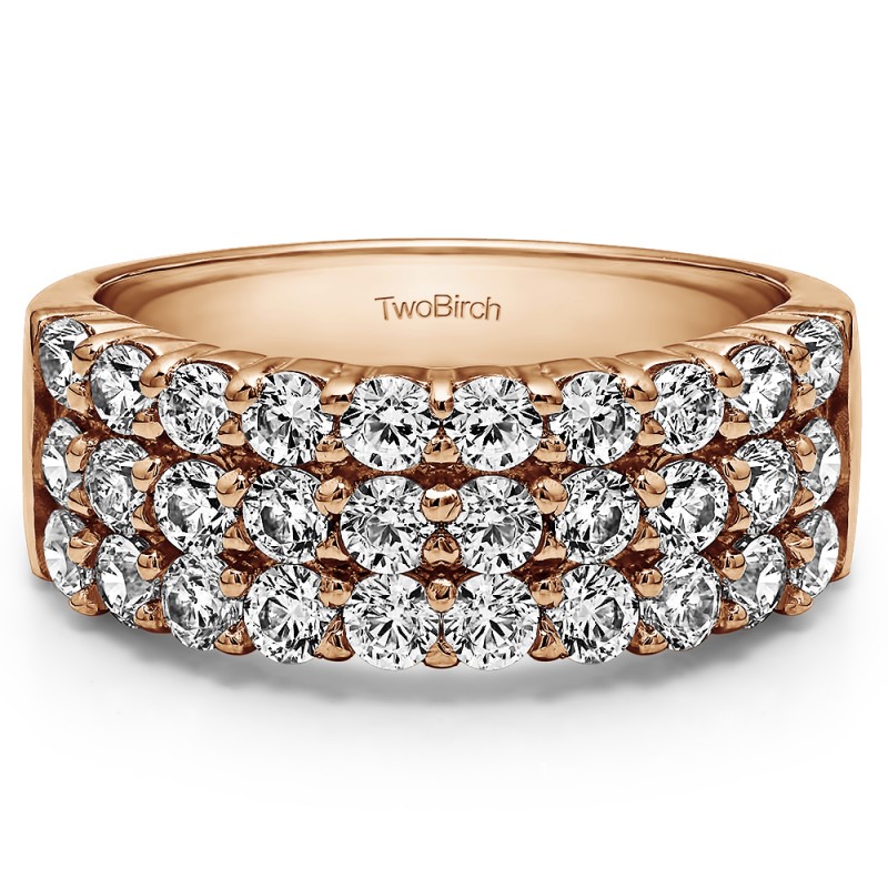 This wedding ring features 30 round prong set stones with a 2 millimeter wide band. The total combined carat weight of the ring is 1.5 carats. It has three rows of common prong stones. This wedding ring weighs approximately 6.39 grams.