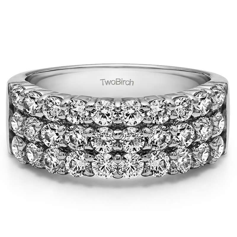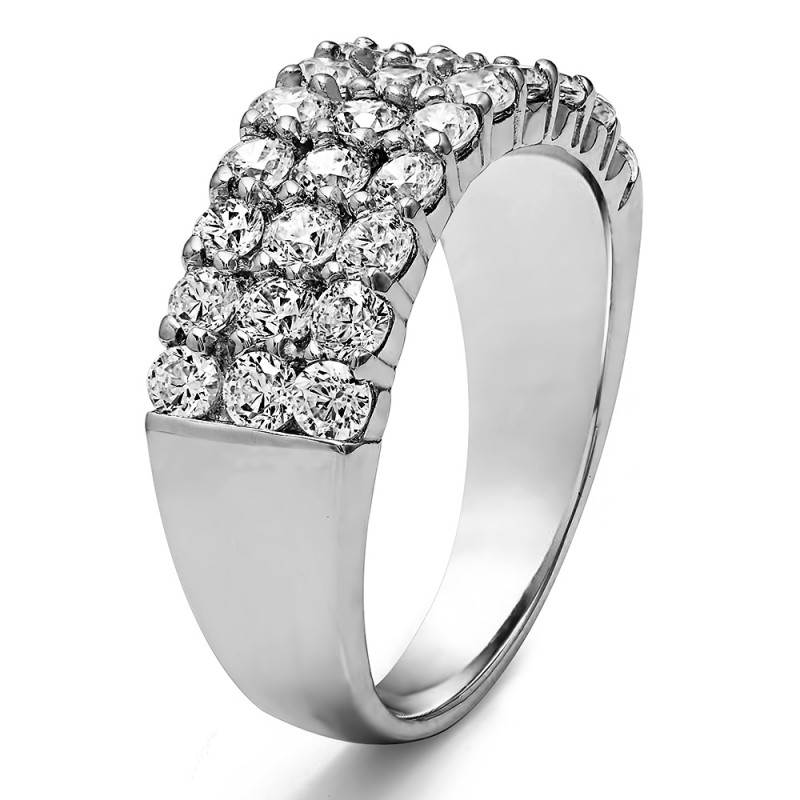 This wedding ring features 30 round prong set stones with a 2 millimeter wide band. The total combined carat weight of the ring is 1.5 carats. It has three rows of common prong stones. This wedding ring weighs approximately 6.39 grams.