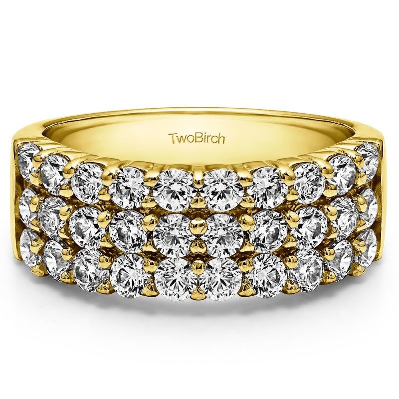This wedding ring features 30 round prong set stones with a 2 millimeter wide band. The total combined carat weight of the ring is 1.5 carats. It has three rows of common prong stones. This wedding ring weighs approximately 6.39 grams.