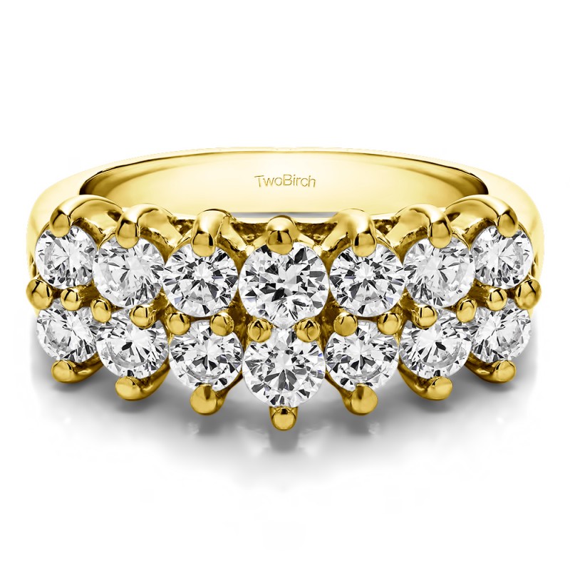 This wedding ring features 14 round prong set stones with a 2 millimeter wide band. The total combined carat weight of the ring is 1.96 carats. Two rows of double shared prongs making this anniversary band both durable and stunning. This wedding ring weighs approximately 6.2 grams.