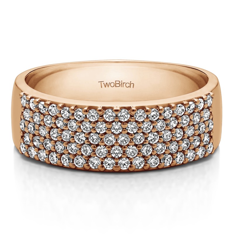 This wedding ring features 1 round prong set stones with a 2 millimeter wide band. The total combined carat weight of the ring is 1 carats. It has a double row of round stones set with shared prongs. This wedding ring weighs approximately 7 grams.