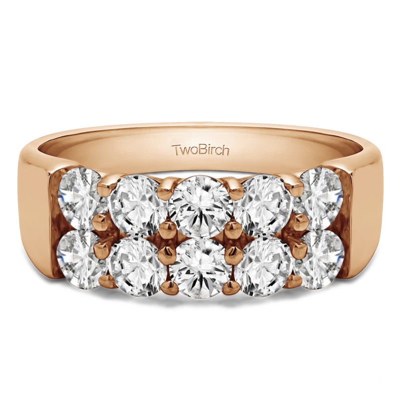 This wedding ring features 10 round prong set stones with a 2 millimeter wide band. The total combined carat weight of the ring is 1 carats. This ring has a double row of shared prong stones. This wedding ring weighs approximately 6.55 grams.
