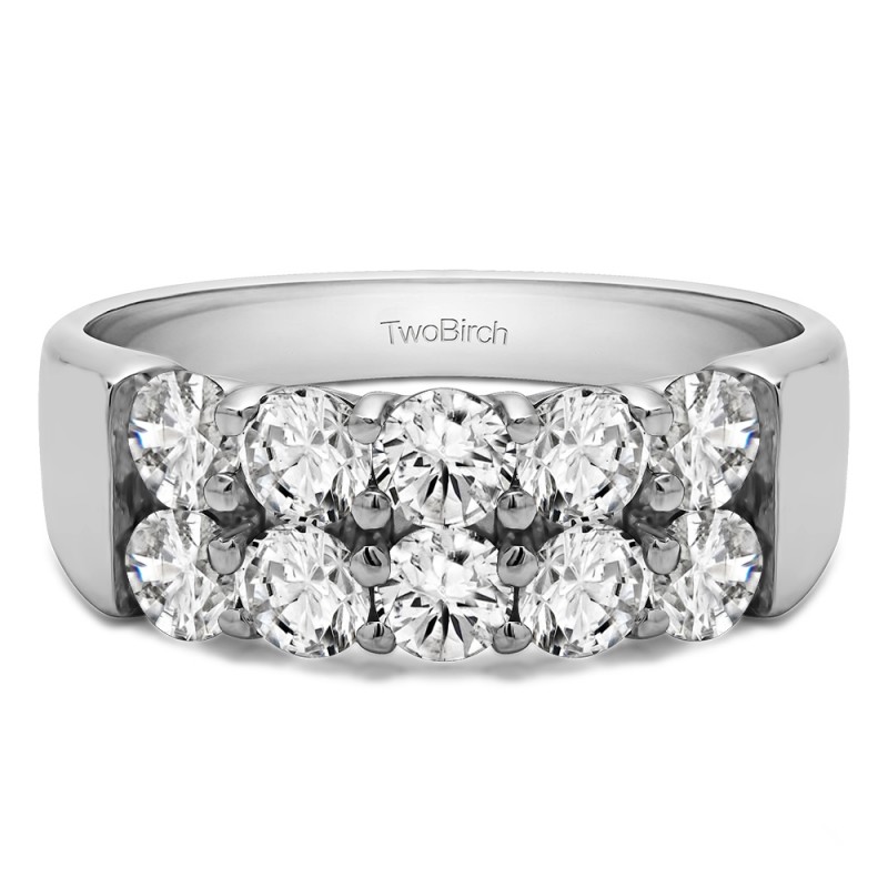 This wedding ring features 10 round prong set stones with a 2 millimeter wide band. The total combined carat weight of the ring is 1 carats. This ring has a double row of shared prong stones. This wedding ring weighs approximately 6.55 grams.