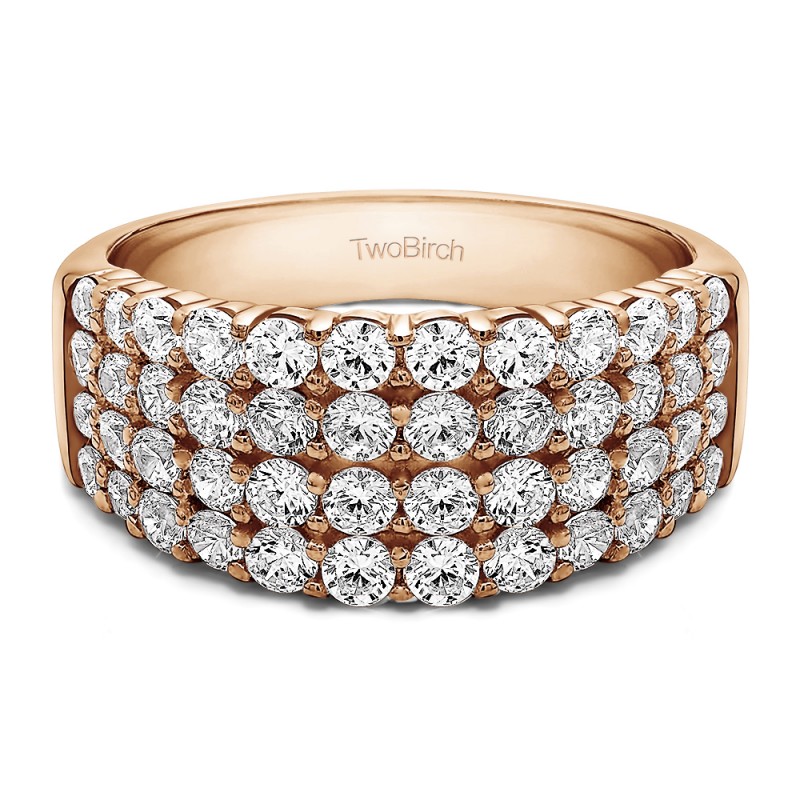 This wedding ring features 48 round prong set stones with a 9.5 millimeter wide band. The total combined carat weight of the ring is 2.04 carats. It has four rows of double shared prong stones. This wedding ring weighs approximately 9.58 grams.