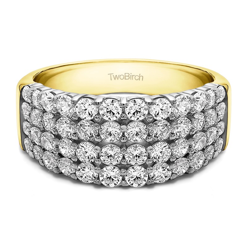This wedding ring features 48 round prong set stones with a 9.5 millimeter wide band. The total combined carat weight of the ring is 2.04 carats. It has four rows of double shared prong stones. This wedding ring weighs approximately 9.58 grams.
