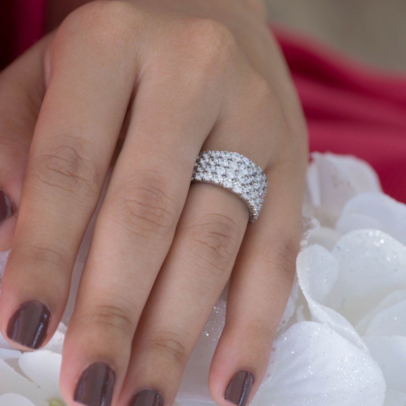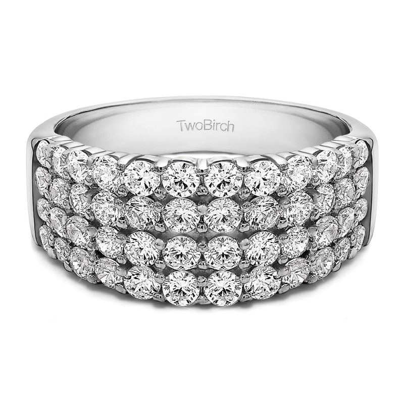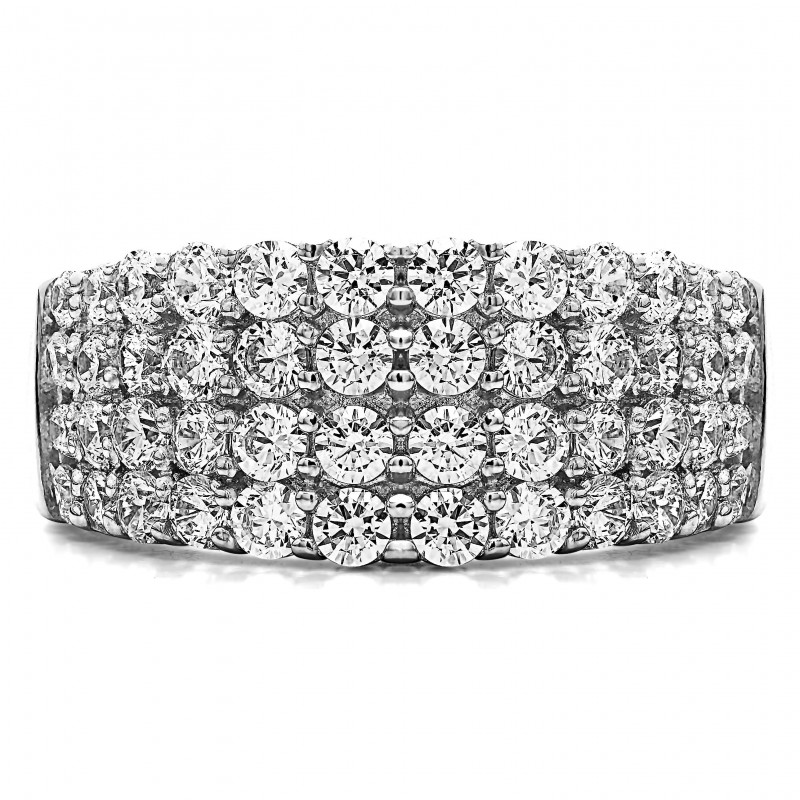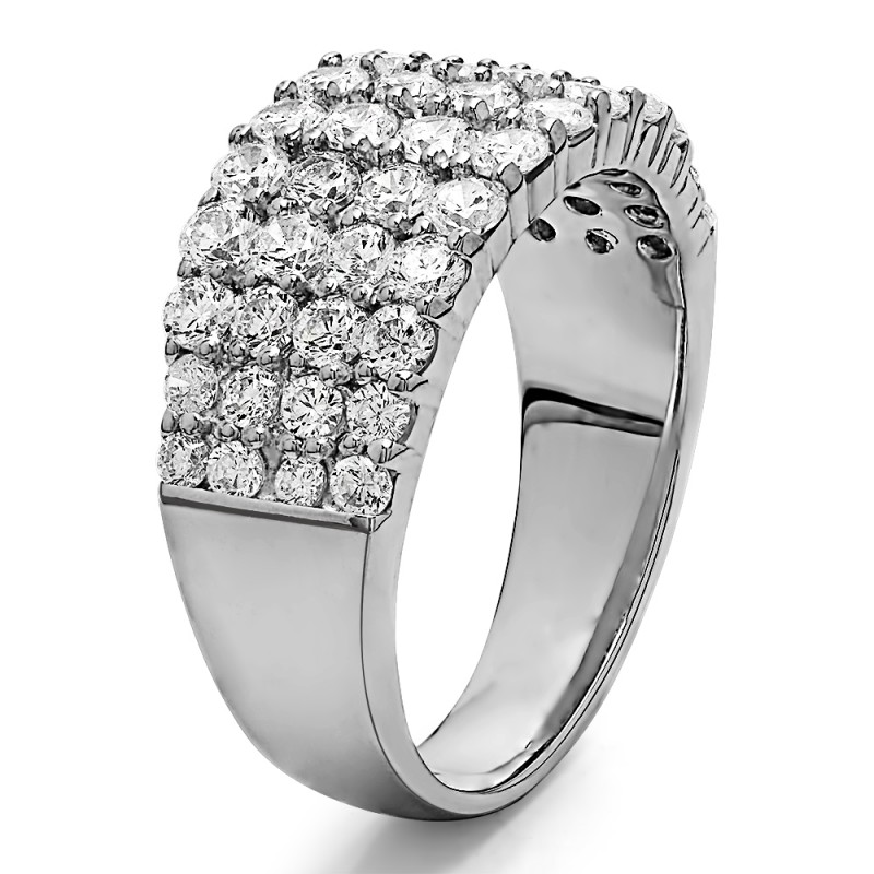 This wedding ring features 48 round prong set stones with a 9.5 millimeter wide band. The total combined carat weight of the ring is 2.04 carats. It has four rows of double shared prong stones. This wedding ring weighs approximately 9.58 grams.