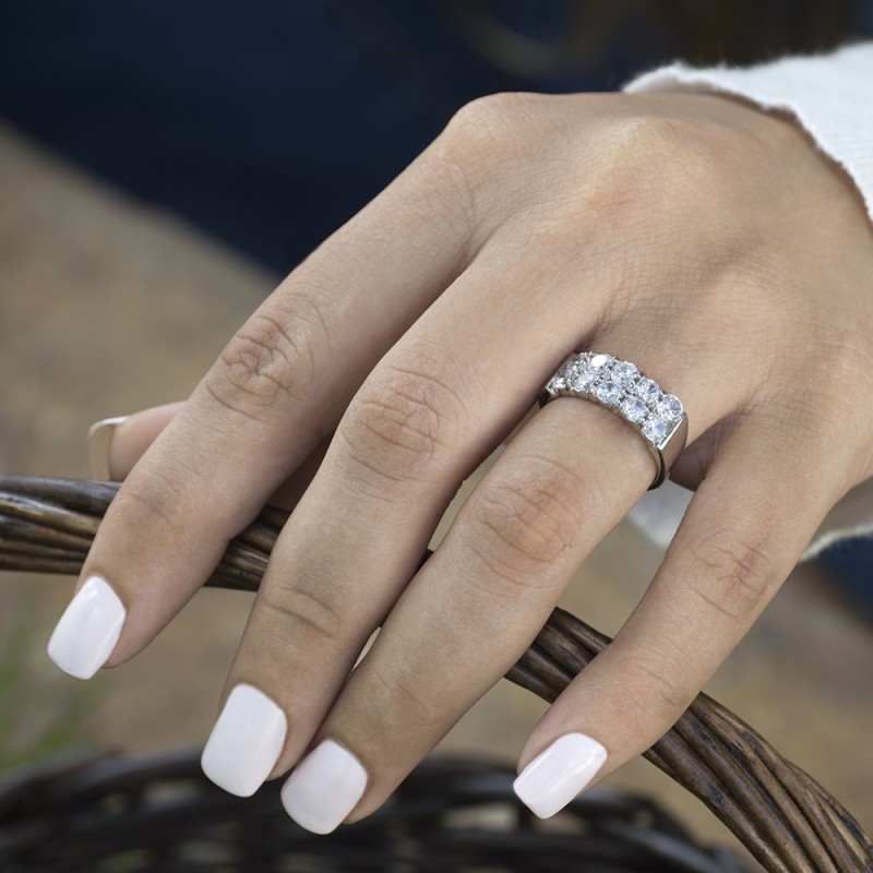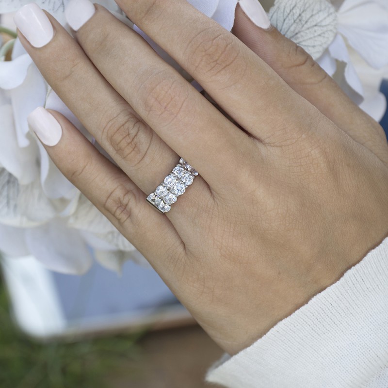 This wedding ring features 10 round prong set stones with a 2 millimeter wide band. The total combined carat weight of the ring is 2 carats. This ring has a double row of shared prong stones. This wedding ring weighs approximately 8.95 grams.
