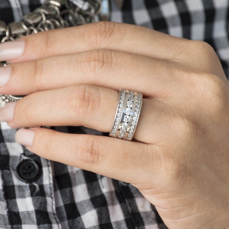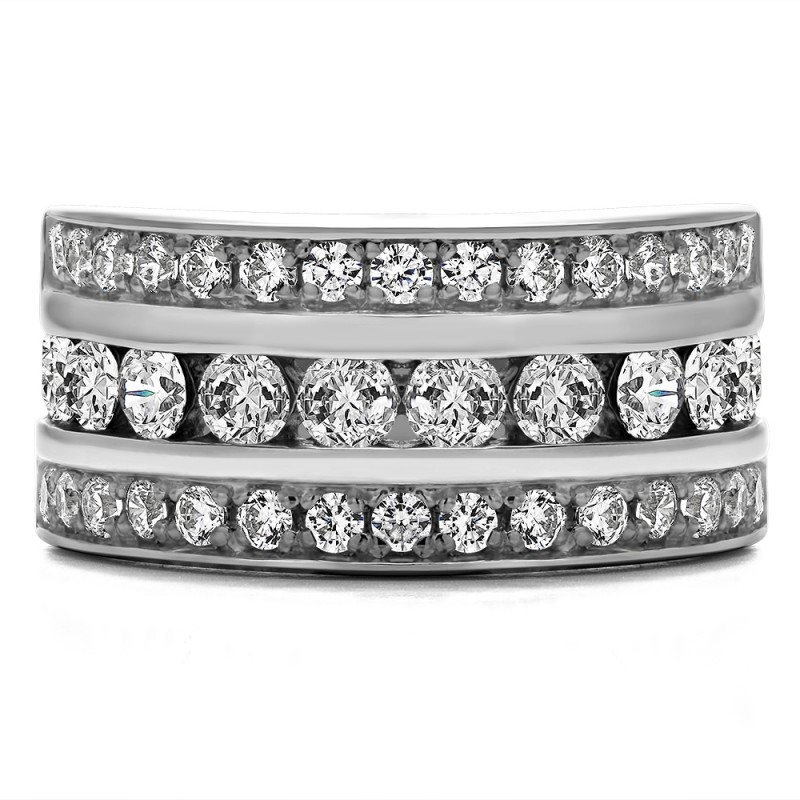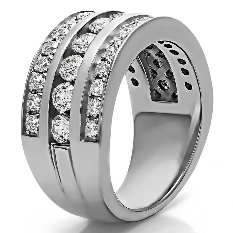 This wedding ring features 40 round channel set stones with a 2 millimeter wide band. The total combined carat weight of the ring is 2 carats. This band is very wide and features three rows of channel set stones. This wedding ring weighs approximately 14.69 grams.