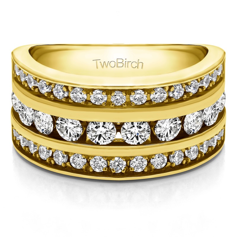 This wedding ring features 40 round channel set stones with a 2 millimeter wide band. The total combined carat weight of the ring is 2 carats. This band is very wide and features three rows of channel set stones. This wedding ring weighs approximately 14.69 grams.