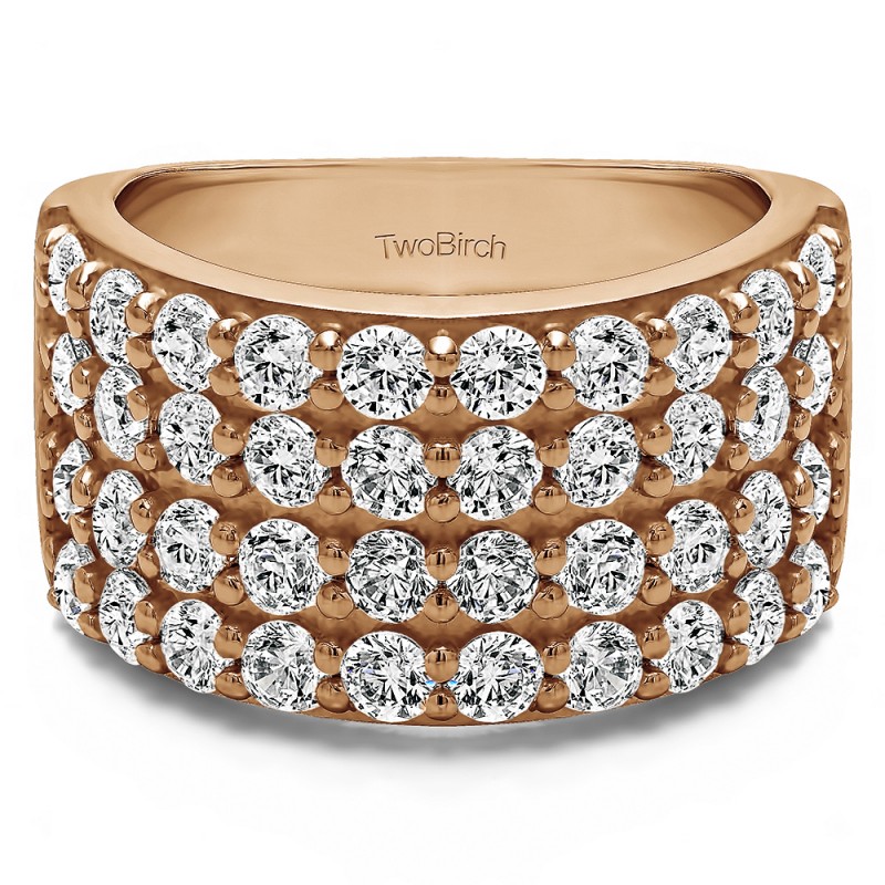 This wedding ring features 40 round prong set stones with a 2 millimeter wide band. The total combined carat weight of the ring is 2 carats. It features four rows of round shared prong set stones. This wedding ring weighs approximately 17.49 grams.