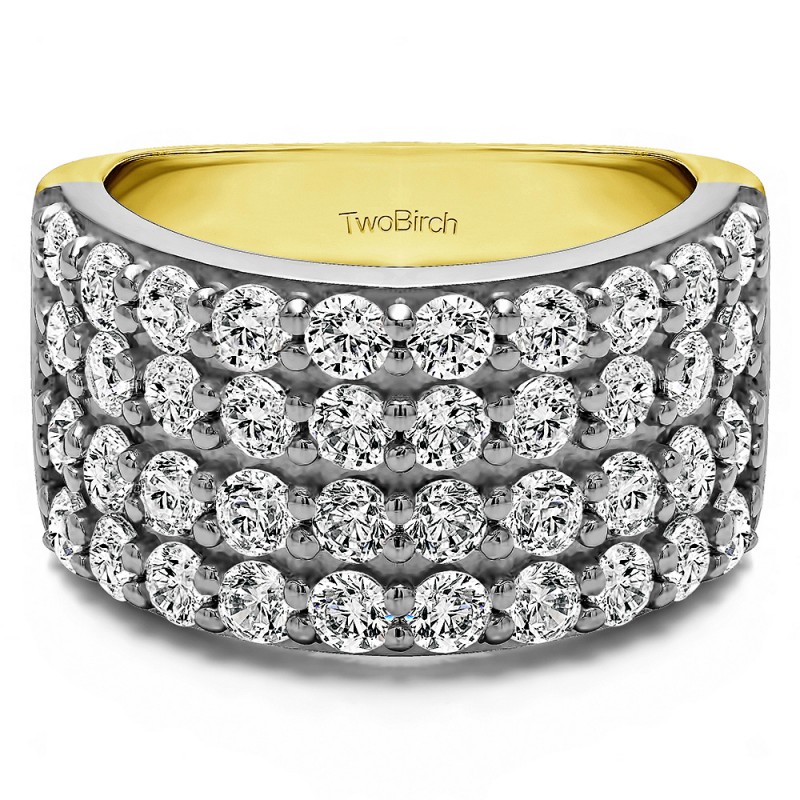 This wedding ring features 40 round prong set stones with a 2 millimeter wide band. The total combined carat weight of the ring is 2 carats. It features four rows of round shared prong set stones. This wedding ring weighs approximately 17.49 grams.