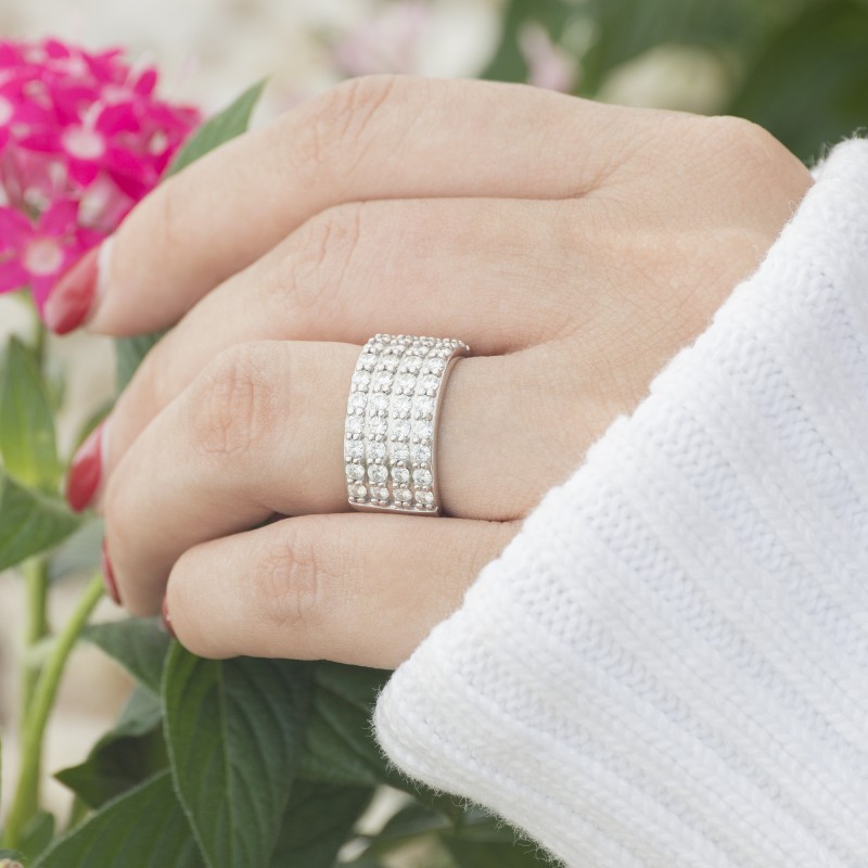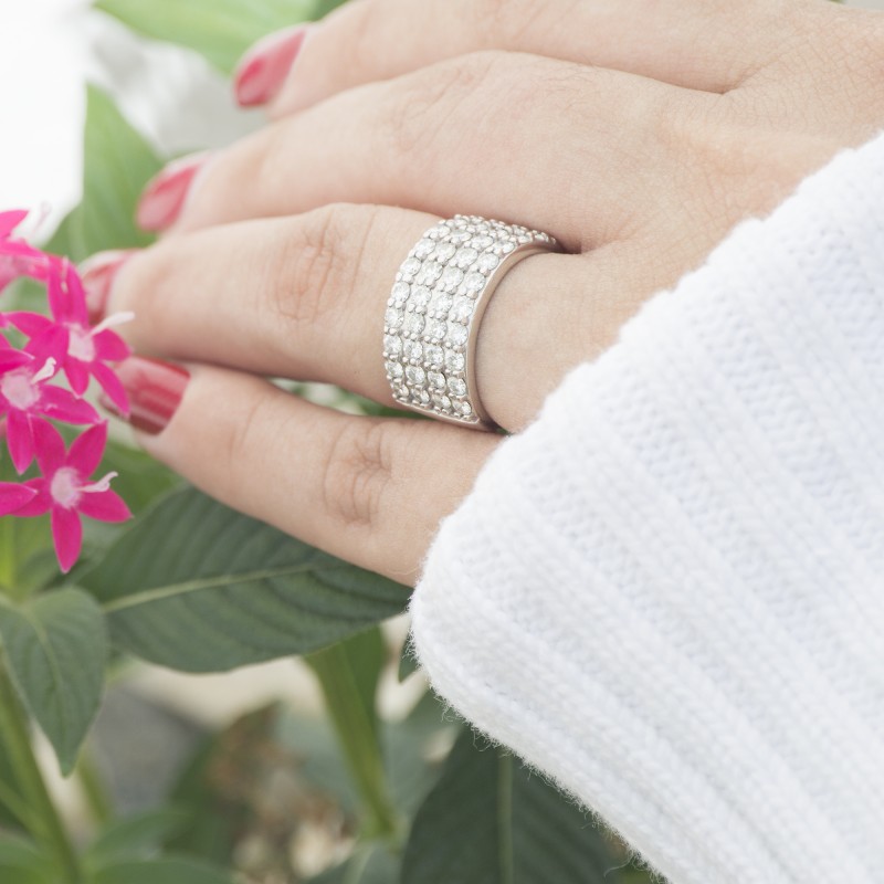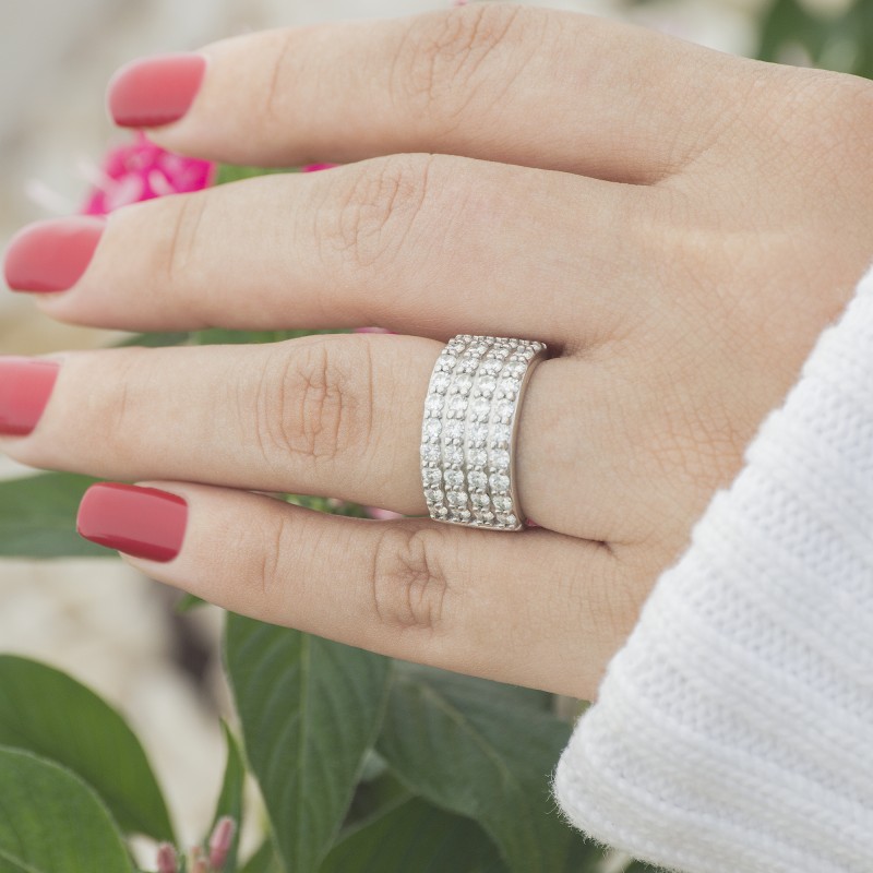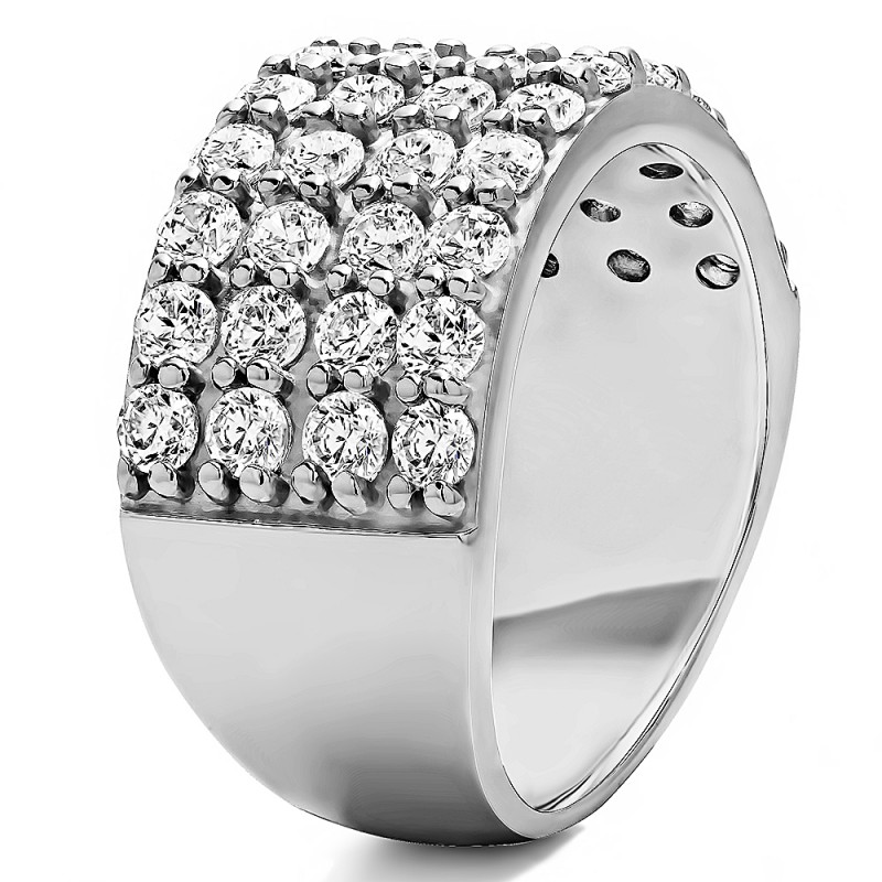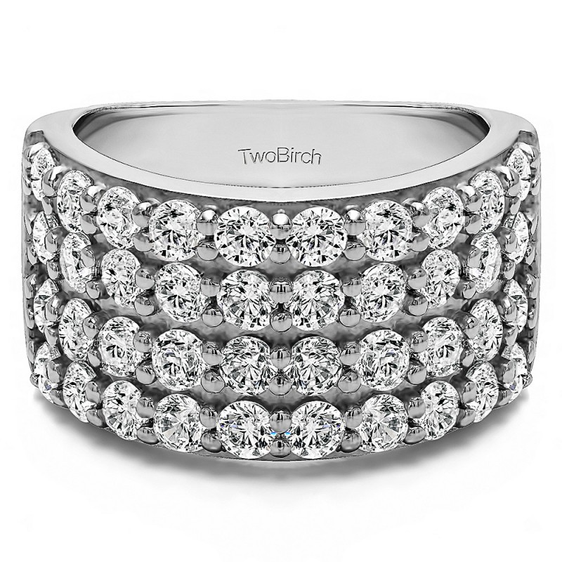 This wedding ring features 40 round prong set stones with a 2 millimeter wide band. The total combined carat weight of the ring is 2 carats. It features four rows of round shared prong set stones. This wedding ring weighs approximately 17.49 grams.