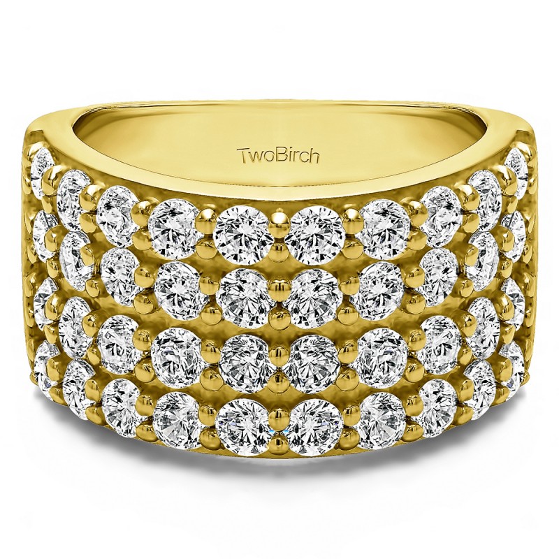 This wedding ring features 40 round prong set stones with a 2 millimeter wide band. The total combined carat weight of the ring is 2 carats. It features four rows of round shared prong set stones. This wedding ring weighs approximately 17.49 grams.