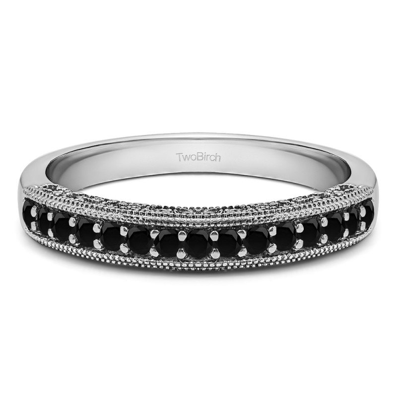 This wedding ring features round pave set stones with a 3 millimeter wide band. The total combined carat weight of the ring is carats. It has filigree designs and millgrained edges. This wedding ring weighs approximately 3.5805 grams.
