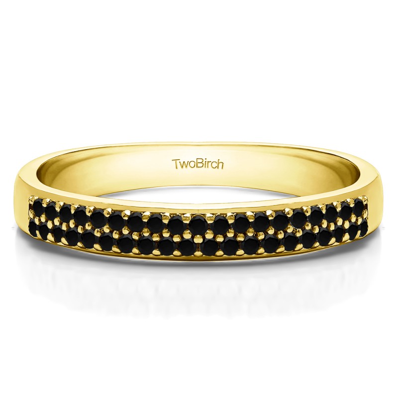 This wedding ring features 40 round prong set stones with a 2 millimeter wide band. The total combined carat weight of the ring is 0.2 carats. It has a double row of round stones set with shared prongs. This wedding ring weighs approximately 5.99 grams.