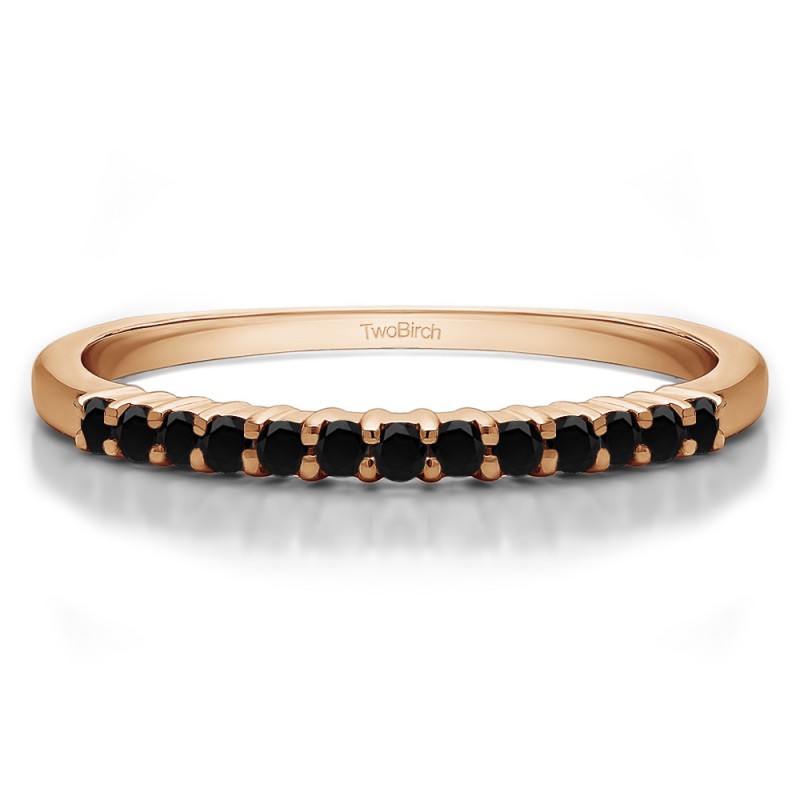 This wedding ring features 13 round prong set stones with a 2 millimeter wide band. The total combined carat weight of the ring is 0.25 carats. It features a double row of shared prong set round stones. This wedding ring weighs approximately 3.17 grams.