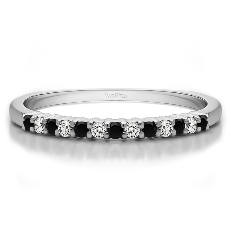 This wedding ring features 13 round prong set stones with a 2 millimeter wide band. The total combined carat weight of the ring is 0.25 carats. It features a double row of shared prong set round stones. This wedding ring weighs approximately 3.17 grams.