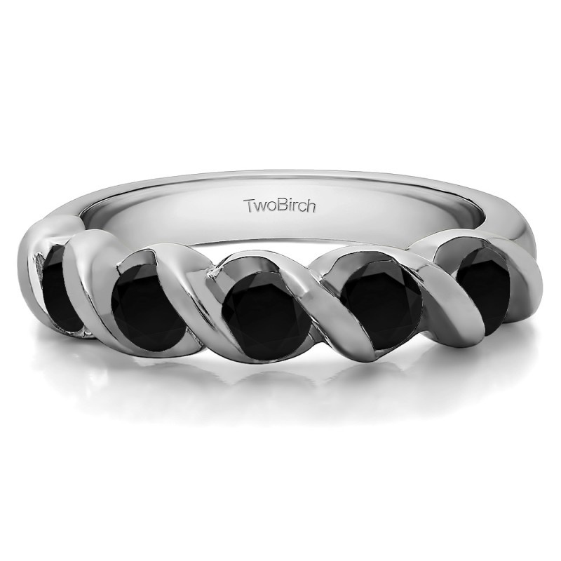 This wedding ring features 5 round bar set stones with a 2 millimeter wide band. The total combined carat weight of the ring is 0.25 carats. Each round stone is separated by a stunning swirl of high polished meal. This wedding ring weighs approximately 3.93 grams.
