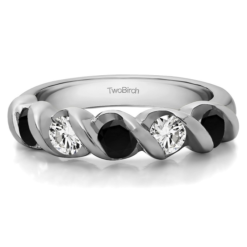 This wedding ring features 5 round bar set stones with a 2 millimeter wide band. The total combined carat weight of the ring is 0.25 carats. Each round stone is separated by a stunning swirl of high polished meal. This wedding ring weighs approximately 3.93 grams.