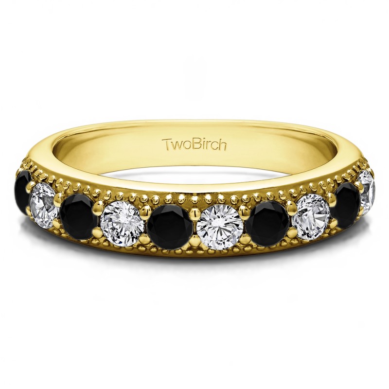 This wedding ring features 11 round prong set stones with a 2 millimeter wide band. The total combined carat weight of the ring is 0.25 carats. It features a small row of millgraining on each side of the band. This wedding ring weighs approximately 4.48 grams.