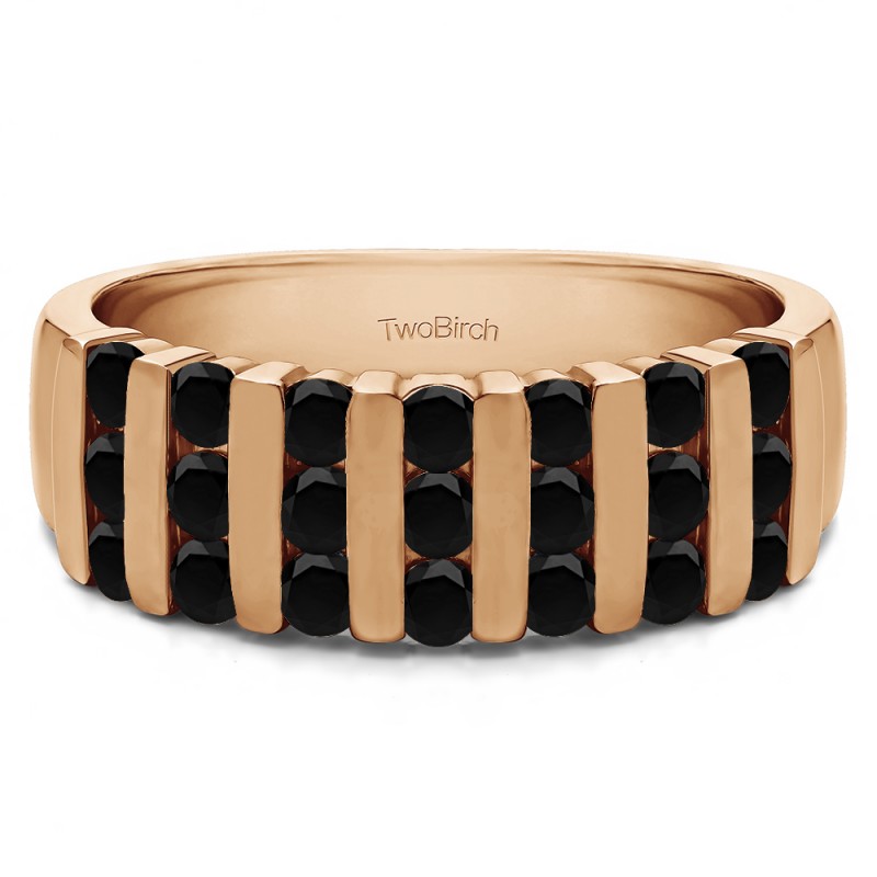 This wedding ring features 21 round bar set stones with a 2 millimeter wide band. The total combined carat weight of the ring is 0.26 carats. It has a unique three row design, set with shared bars. The shared bars are finished with a high polish. This wedding ring weighs approximately 4.39 grams.