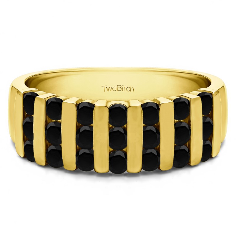 This wedding ring features 21 round bar set stones with a 2 millimeter wide band. The total combined carat weight of the ring is 0.26 carats. It has a unique three row design, set with shared bars. The shared bars are finished with a high polish. This wedding ring weighs approximately 4.39 grams.