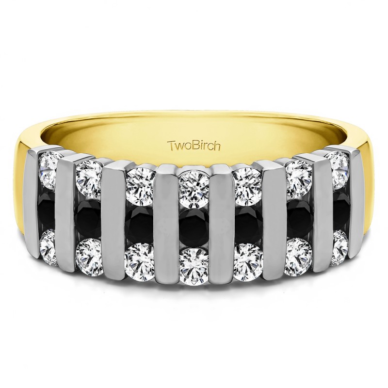 This wedding ring features 21 round bar set stones with a 2 millimeter wide band. The total combined carat weight of the ring is 0.26 carats. It has a unique three row design, set with shared bars. The shared bars are finished with a high polish. This wedding ring weighs approximately 4.39 grams.