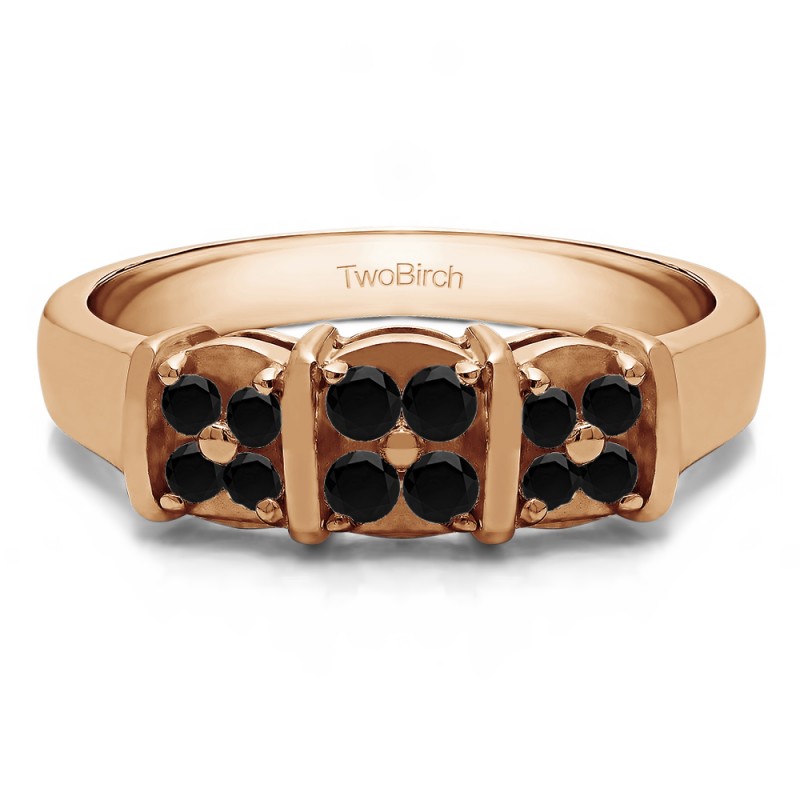 This wedding ring features 12 round bar set stones with a 2 millimeter wide band. The total combined carat weight of the ring is 0.31 carats. It is set in a way that gives the stones the appearance of a flower. This wedding ring weighs approximately 4.45 grams.