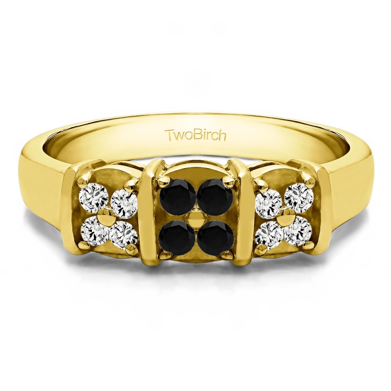 This wedding ring features 12 round bar set stones with a 2 millimeter wide band. The total combined carat weight of the ring is 0.31 carats. It is set in a way that gives the stones the appearance of a flower. This wedding ring weighs approximately 4.45 grams.