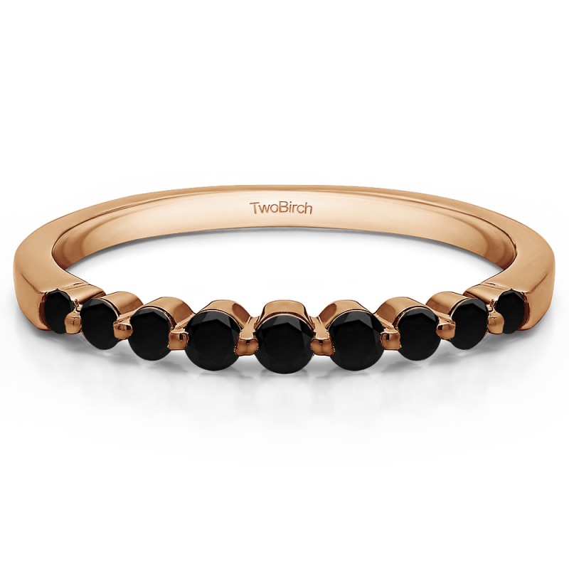 This wedding ring features 9 round bezel set stones with a 2 millimeter wide band. The total combined carat weight of the ring is 0.33 carats. It has a pinched shank and stones set with a shared prong. This wedding ring weighs approximately 2.75 grams.