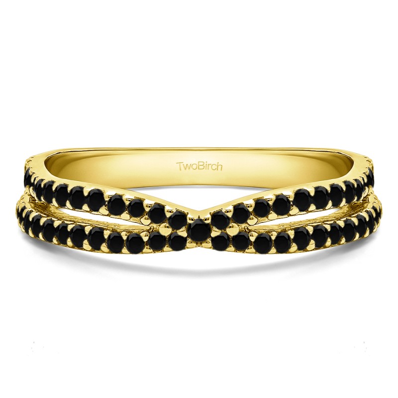 This wedding ring features 61 round prong set stones with a 2 millimeter wide band. The total combined carat weight of the ring is 0.46 carats. This ring has a criss cross design with a single row of stones accenting the design. This wedding ring weighs approximately 6.24 grams.