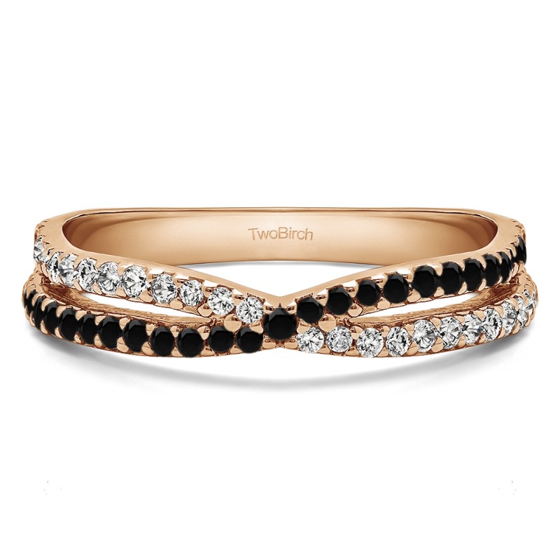 This wedding ring features 61 round prong set stones with a 2 millimeter wide band. The total combined carat weight of the ring is 0.46 carats. This ring has a criss cross design with a single row of stones accenting the design. This wedding ring weighs approximately 6.24 grams.